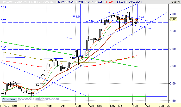 Una vez ajustado al gráfico al dividendo que repartió el pasado  lunes, la zona clave horizontal de soporte en gráfico mensual se  encontraría en torno a los 3,76 Euros. Y la proyección teórica de la  bandera sobre los 5,50. El valor habría tenido dos impulsos y, al menos,  le quedaría otro mayor, por lo que no descartaría una proyección  superior; esto es, la proyección del canal superado al alza o la  proyección del triángulo rectángulo.