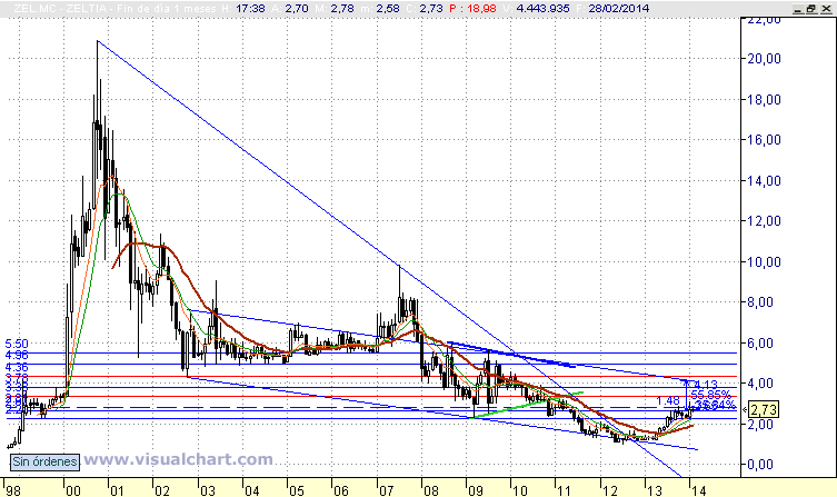 Zeltia ya ha construido su suelo y ha superado con claridad la media  ponderada de 30 meses, de suerte que estaría a medio camino de llegar a  la directriz superior del gran canal descendente. Durante la subida del  precio que espero, éste se va a encontrar -se está encontrando ya- con  una amplia zona de congestión: la que corresponde a los abruptos  movimientos del precio durante los años 2009 y 2010. Probablemente,  durante la subida habrá más movimientos correctivos, pero yo creo, por  la paua que les he señalado en este gráfico mensual de abajo, que la  subida va a continuar a partir de estos momentos con cierta rapidez,  hasta la directriz superior del canal. Luego... ya lo iremos viendo.