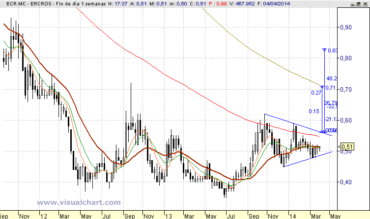No desesperen los seguidores de Ercros, pues es un valor que saldrá al  alza con semejante fuerza a la mostrada por Tecnocom durante las últimas  dos semanas. En algún análisis he comentado que eran dos valores con  aspecto semejante, pero que Tecnocom tenía una estructura más avanzada.  Tecnocom ya ha comenzado su movimiento, Ercros lo comenzará, y creo que  ya le falta poco.