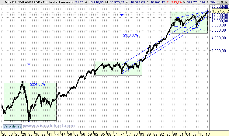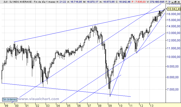 La pregunta sería ¿la bolsa norteamericana ya ha  subido mucho? ¿Ha subido demasiado? ¿Es una subida excesiva e  insostenible? Yo no me voy a meter en otras cuestiones ni en otros  ratios, tan sólo me fijo en los gráficos.