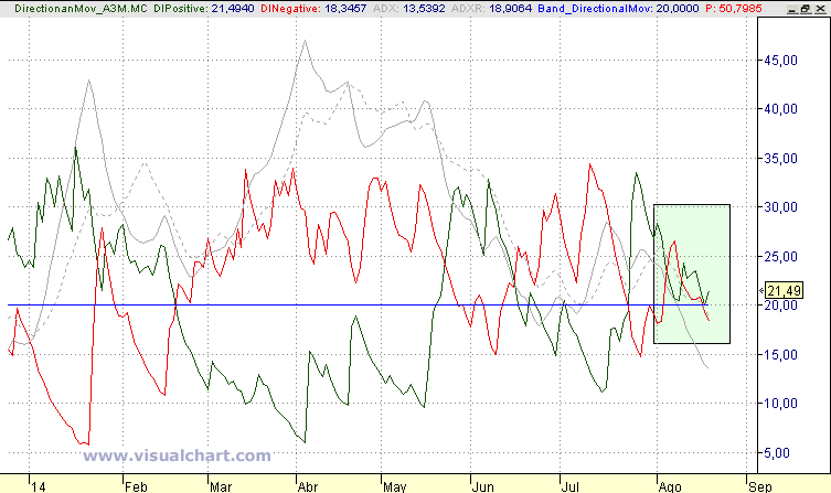 La estructura del Movimiento Direccional diario, con el positivo y el  negativo moviéndose en la misma dirección descendente, nos indica que  el futuro movimiento del precio va a ser rápido. Si deciden entrar y ese  movimiento es alcista, miel sobre hojuelas, pero por si el movimiento  es bajista el stop de pérdidas podría situarse en la pérdida al tick de  los mínimos de la pasada semana: 10,67.