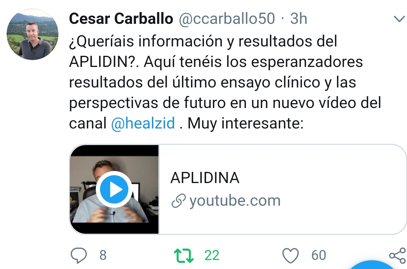 El médico, que trabaja en el Hospital Ramón y Cajal, uno de los primeros centros en realizar pruebas con Aplidin en humanos, aseguraba en su cuenta de Twitter que para entonces se había tratado a nueve pacientes en total, y que el ensayo "se había detenido para concretar la dosis óptima de seguridad" pero que se había reanudado ya hace unos días.