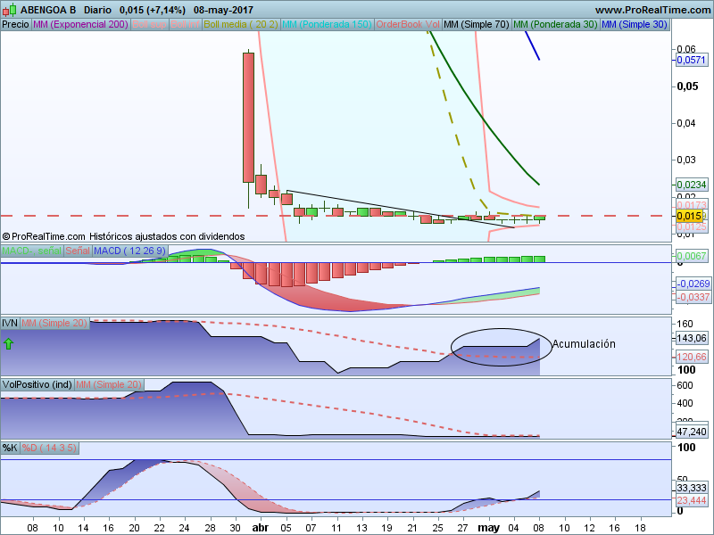 La cotización de Abengoa tiene en los 0,013 un suelo bastante fuerte y ahora se encuentra en una fase lateral que va de esos 0,013 hasta los 0,015. La superación con elevado volumen de ese lateral abriría las puertas hacia los 0,018 y de superarse se podrían visitar los 0,025 y si la volatilidad es extrema no descartamos los 0,030.